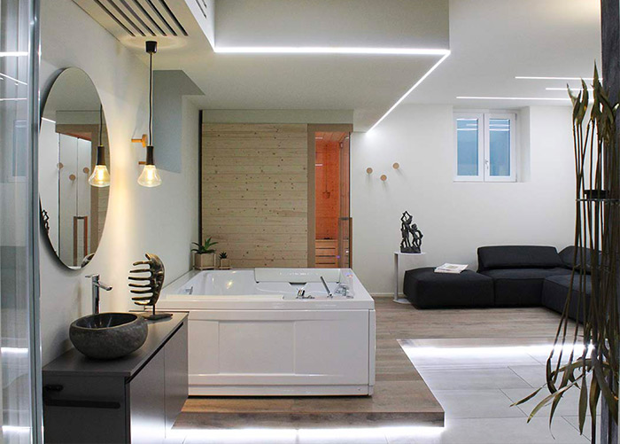 Un altro progetto degno di nota è Siegfrid - Spa, un open space che ospita una zona relax, sauna e vasca idromassaggio, progettato per offrire un'oasi di benessere e tranquillità. Qui, i colori tenui delle pareti si contrappongono agli arredi, creando un ambiente rilassante, ma allo stesso tempo vibrante. Elementi come il legno, utilizzato nella pedana e nella sauna, e una vasca idromassaggio quadrata, evidenziano come la scelta dei materiali possa influenzare profondamente l'atmosfera di uno spazio, arricchendola.