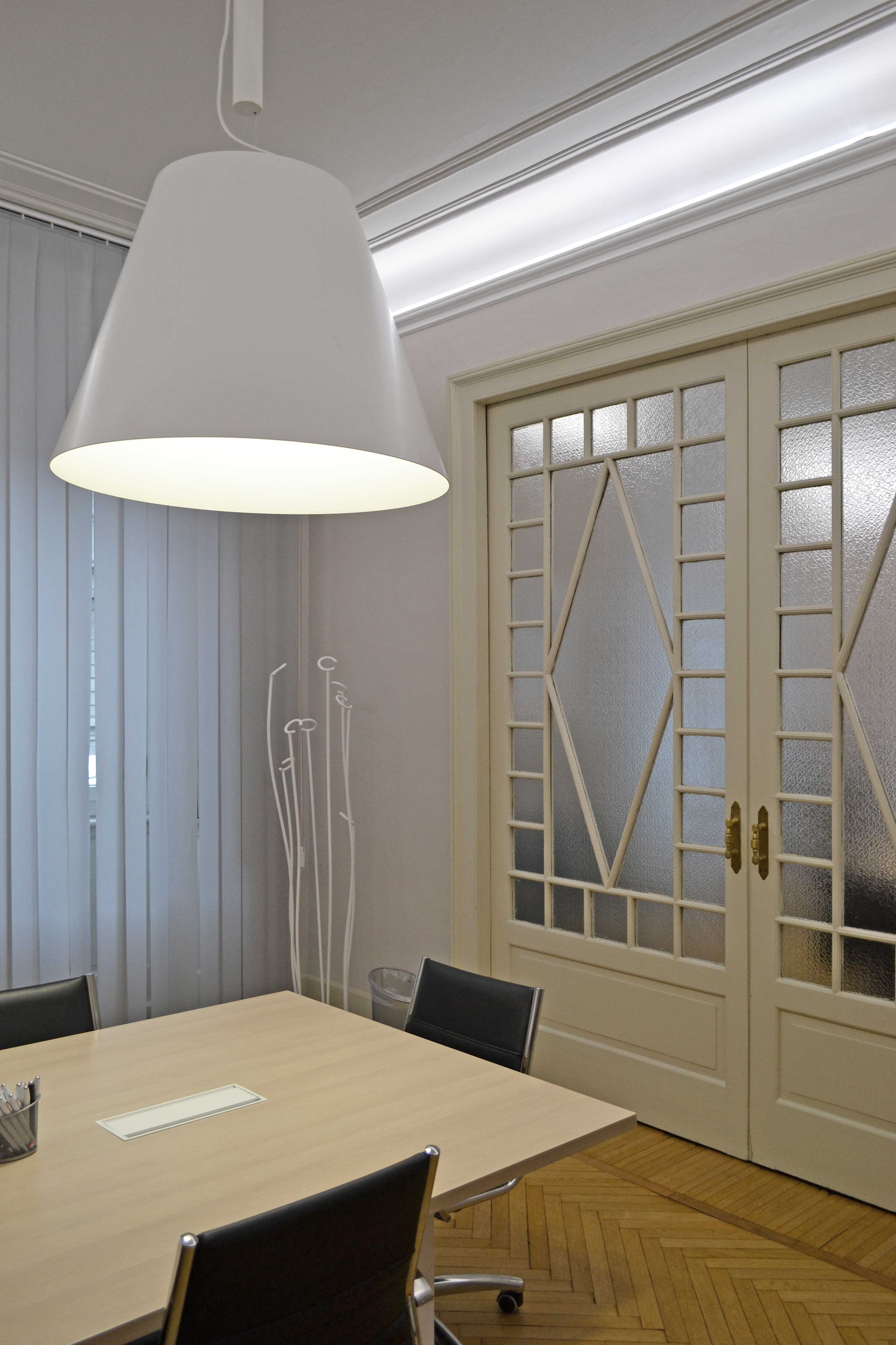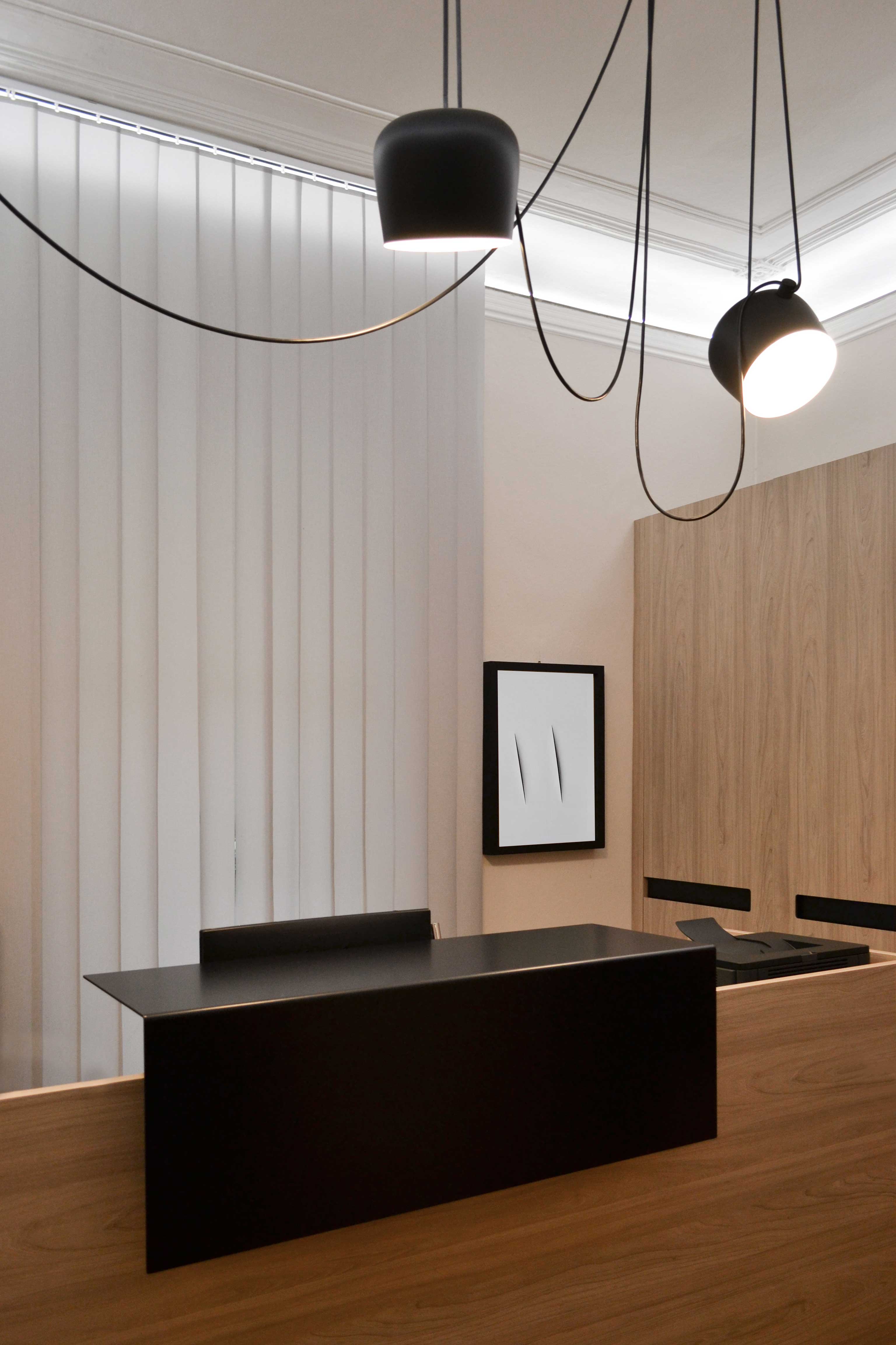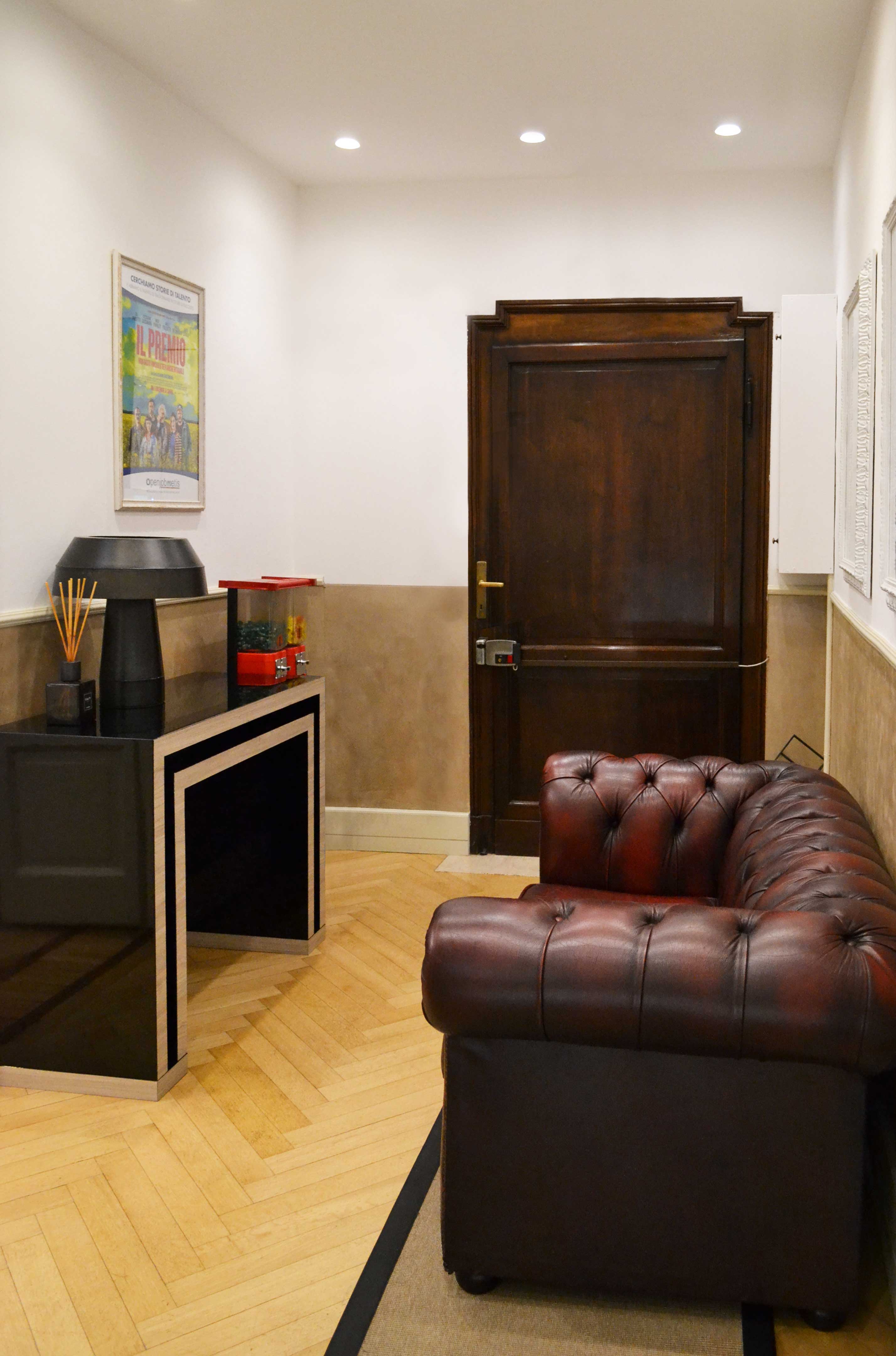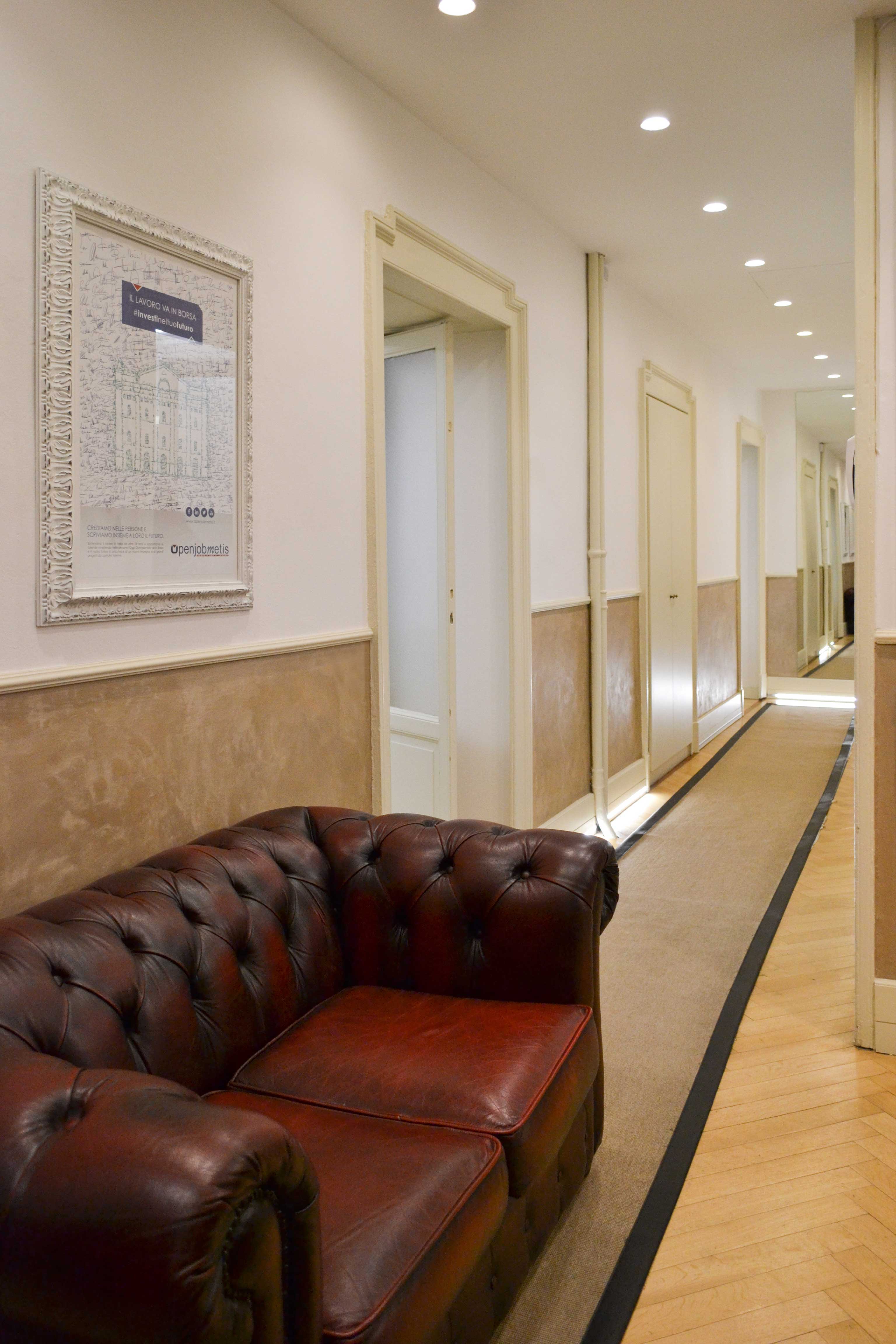 Interni commerciali: Il parquet a spina italiana lasciato nei suoi toni naturali accompagna il fruitore dall’ingresso ai vari uffici e alle sale riunioni, diventando il filo conduttore tra elementi caratteristici dal gusto classico e prodotti attuali dal sapore industrial.