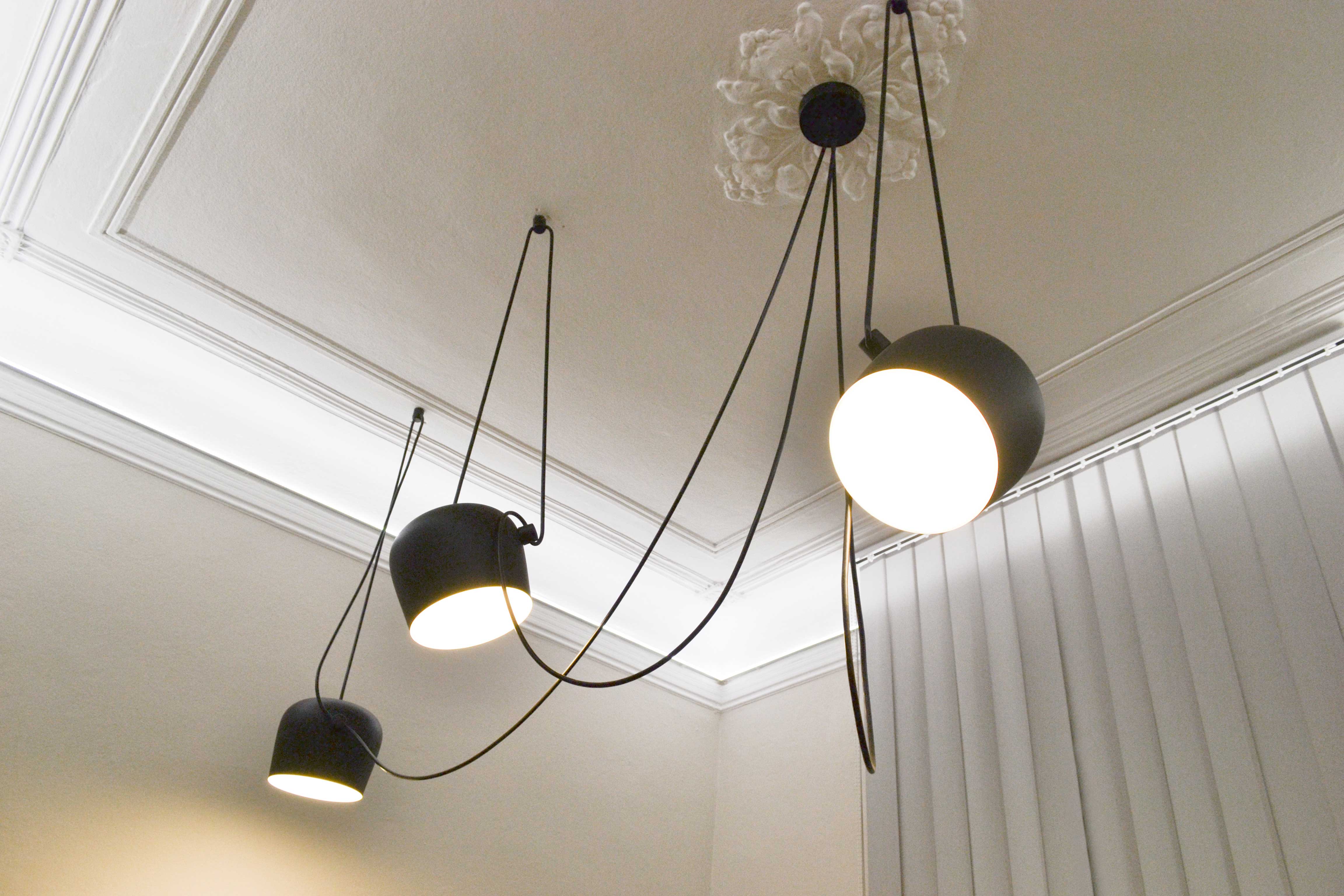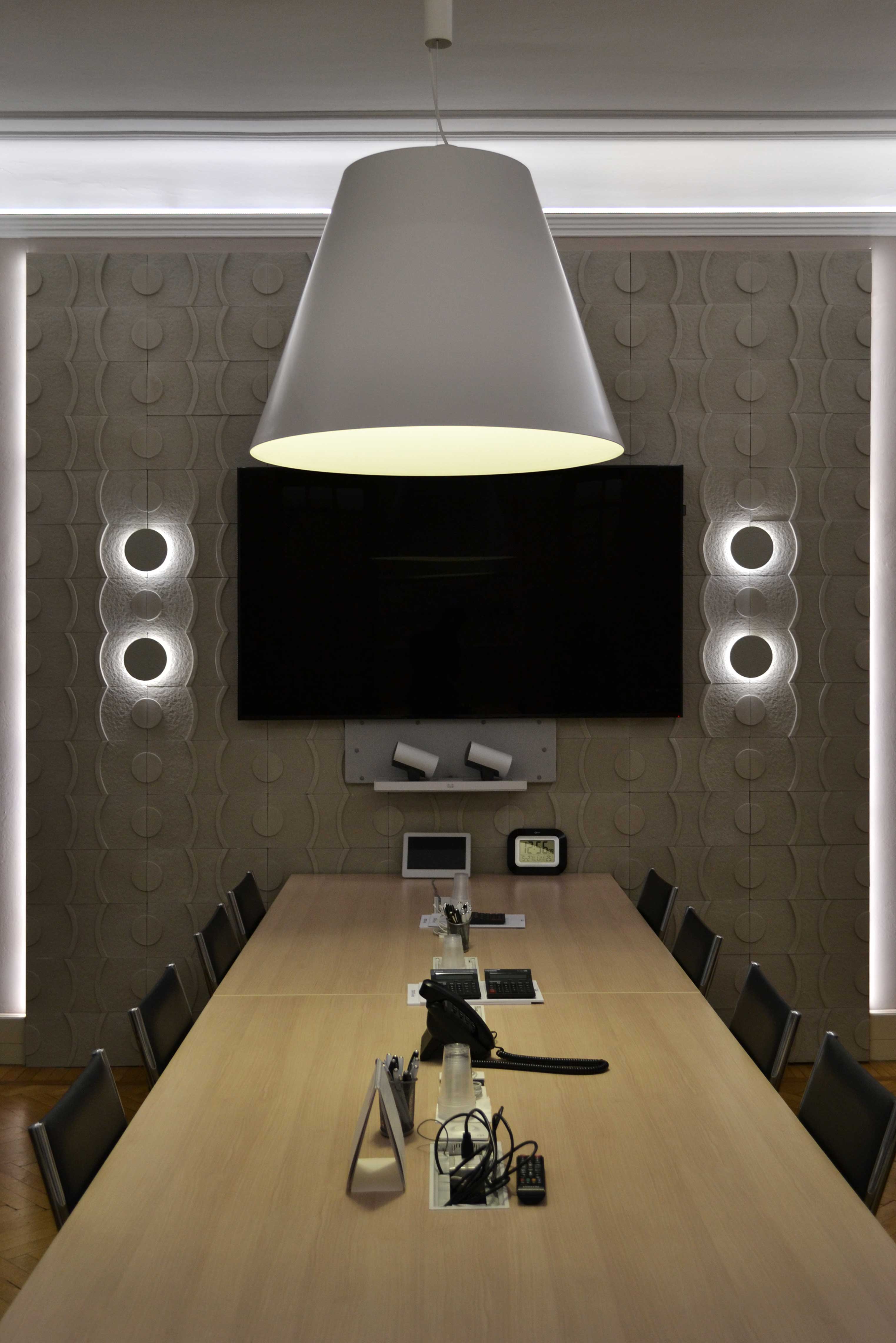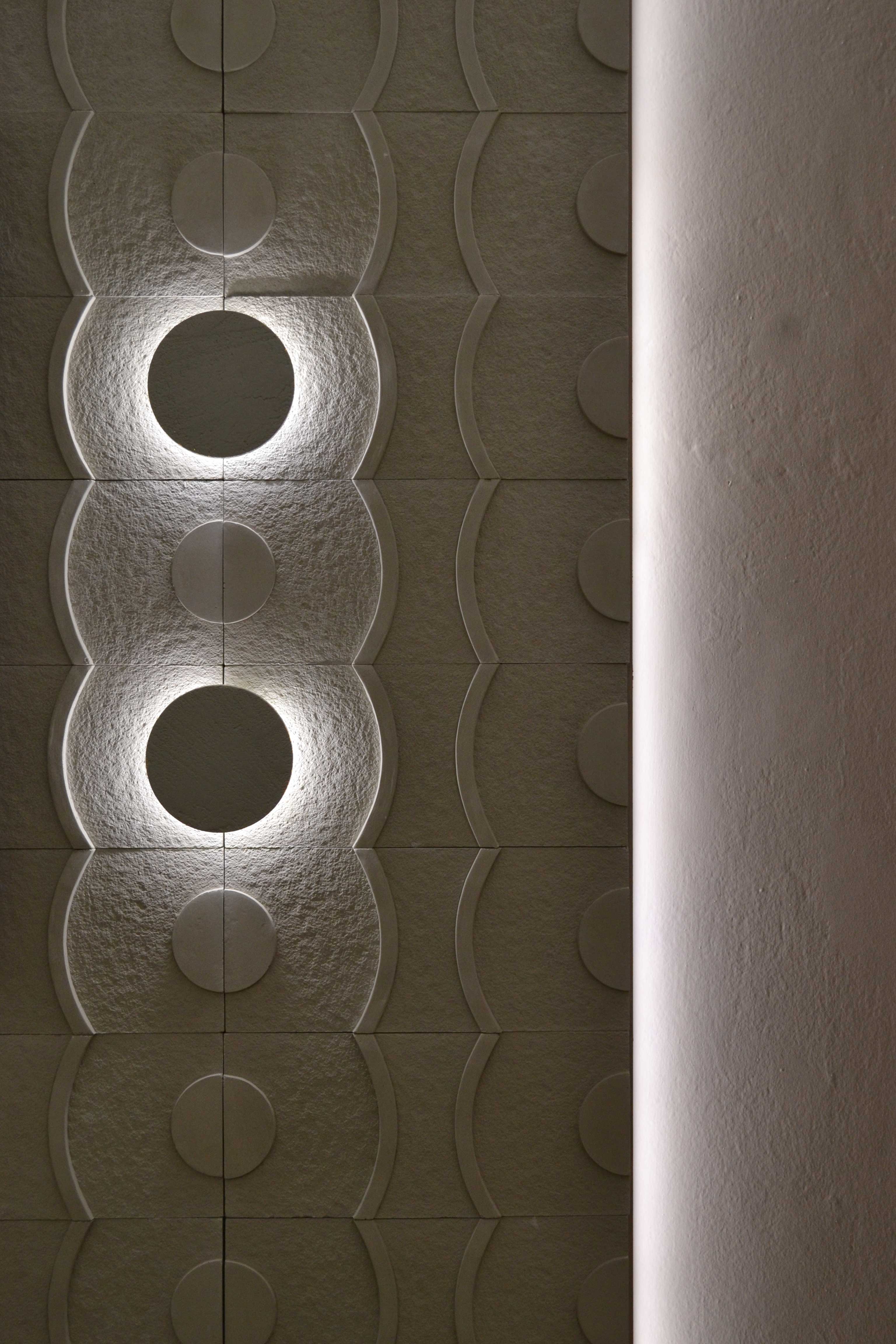 Il sofà in pelle bordeaux, il distributore di caramelle vintage, la boiserie in pietra dalle forme sinuose risaltando dalla contrapposizione del nero lucido degli arredi, dal metallo crudo della lampada da tavolo e dalla accattivante semplicità delle icone del passato e del presente del mondo dell’illuminazione. Un connubio tra l'eleganza dei tempi passati e gli elementi contemporanei.