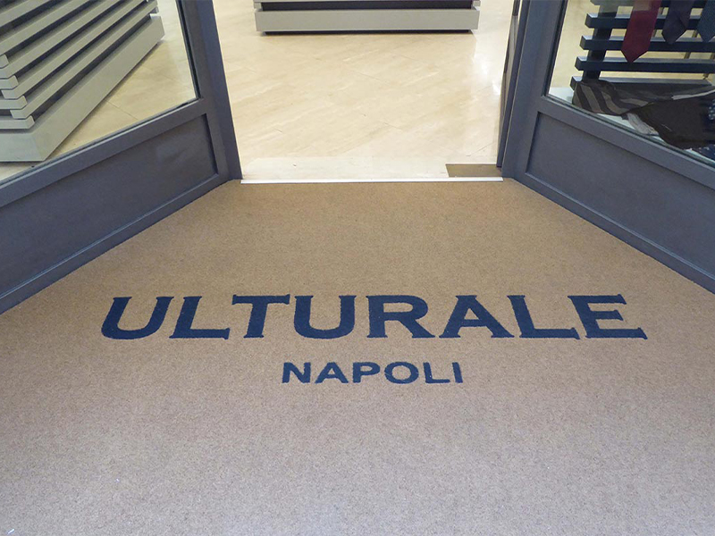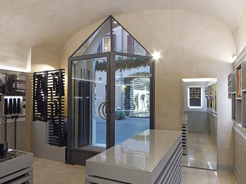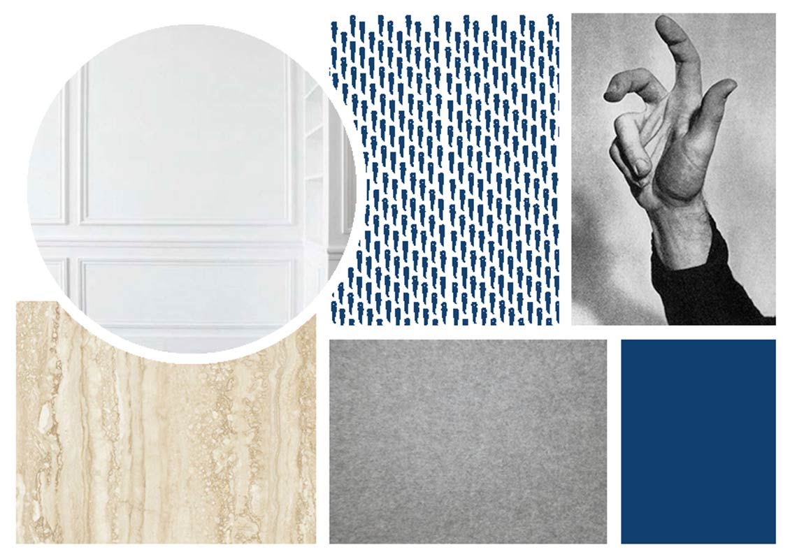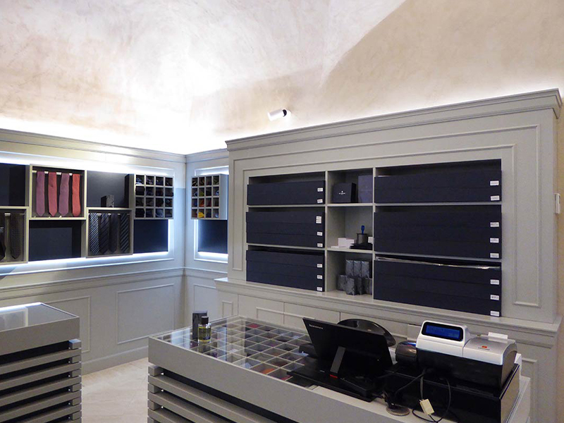 Interni commerciali: L’esigenza di avere uno spazio nuovo e moderno ma con radici forti nel passato. Il blu otremare e il grigio, le doghe orizzontali, i quadri retro illuminati. Eleganza senza ostentazioni.