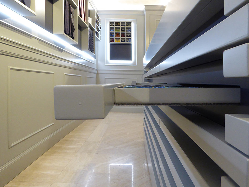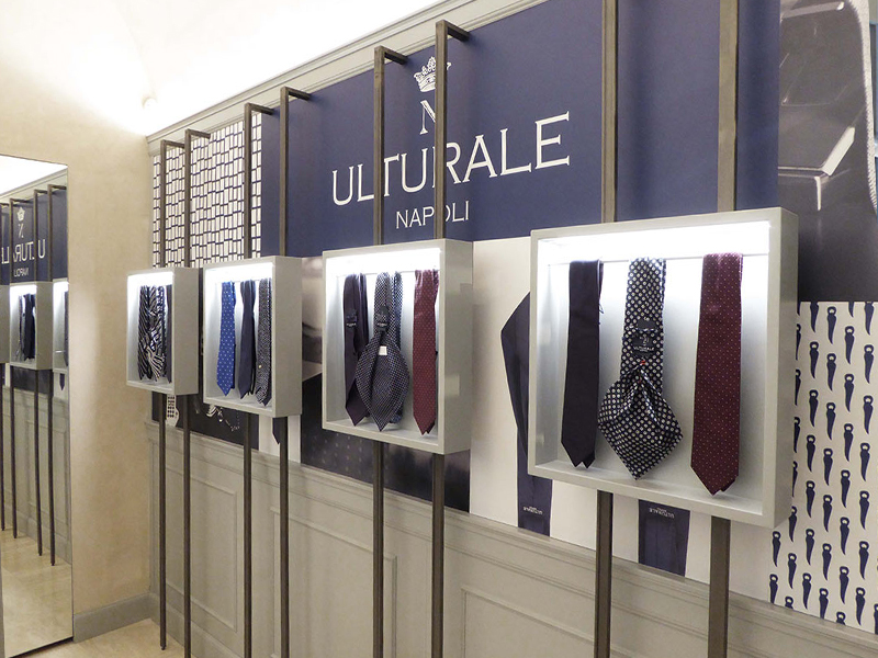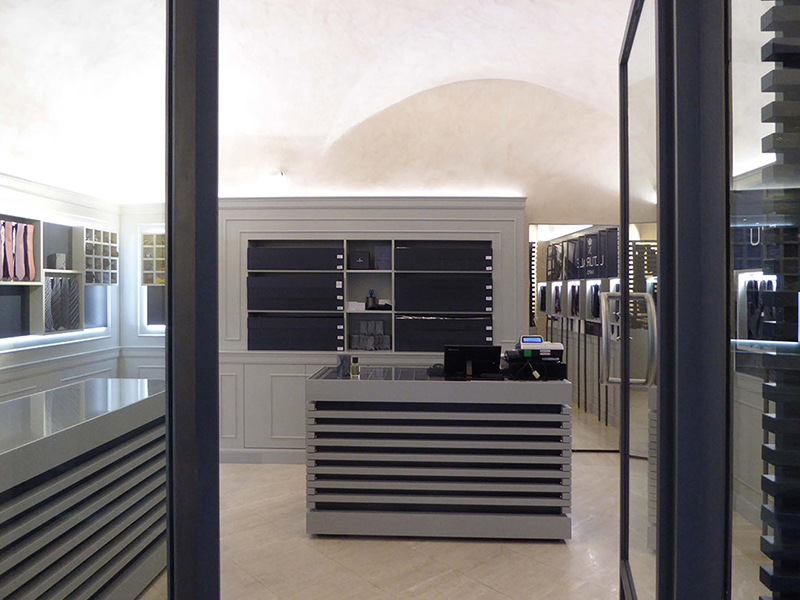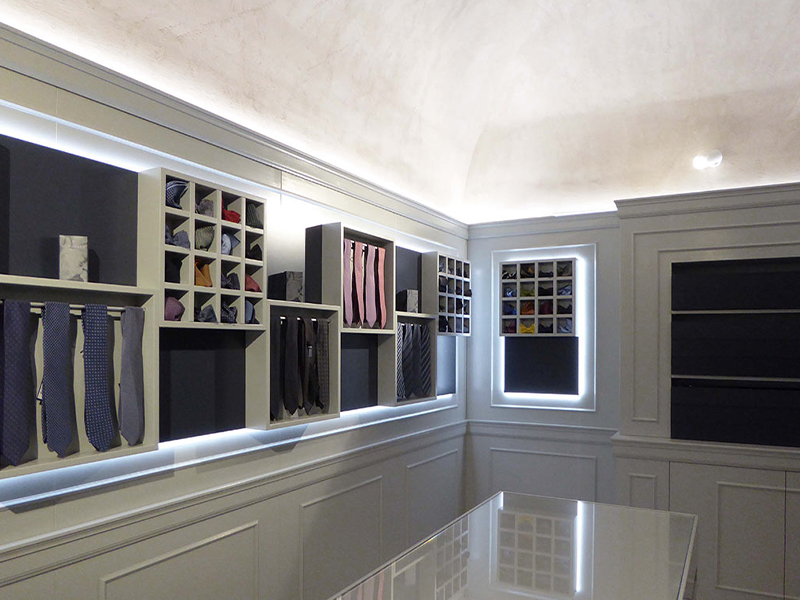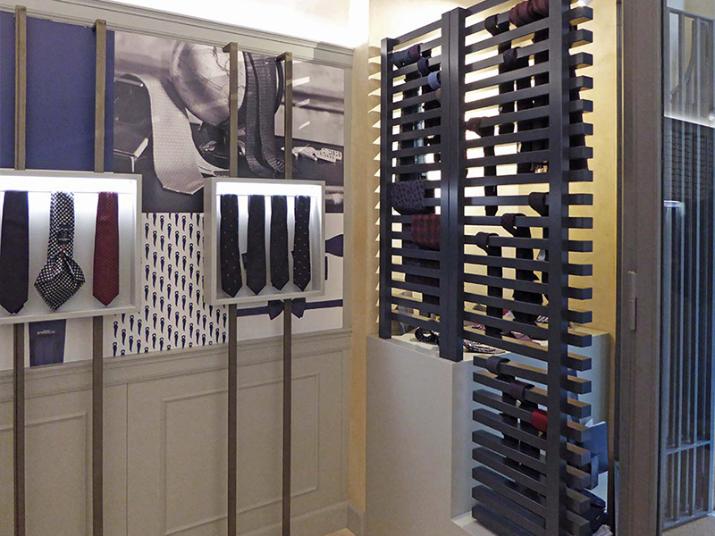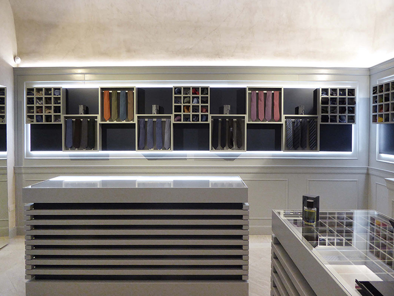 Due grandi cassettiere espositive su misura caratterizzate da doghe orizzontali nei toni del brand, espositori verticali pieni e vuoti retroilluminati valorizzano i prodotti e illuminano l’ambiente. Composizioni semplici e minimaliste armonizzate dal fascino della boiserie.