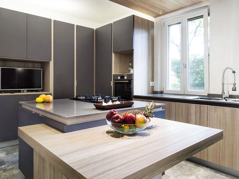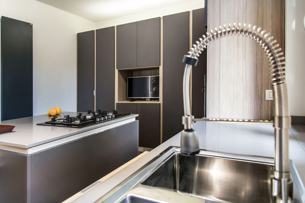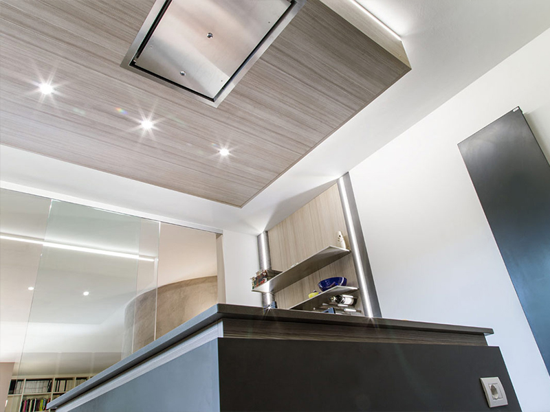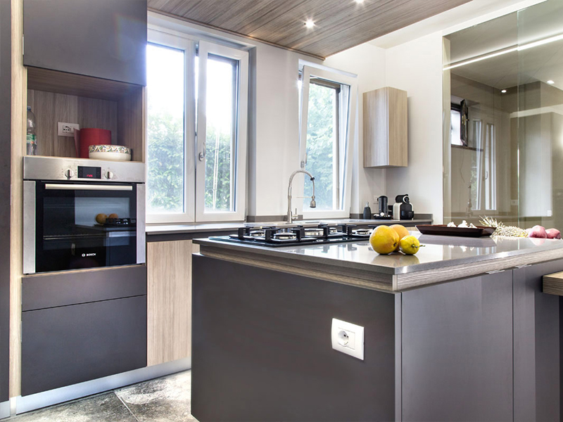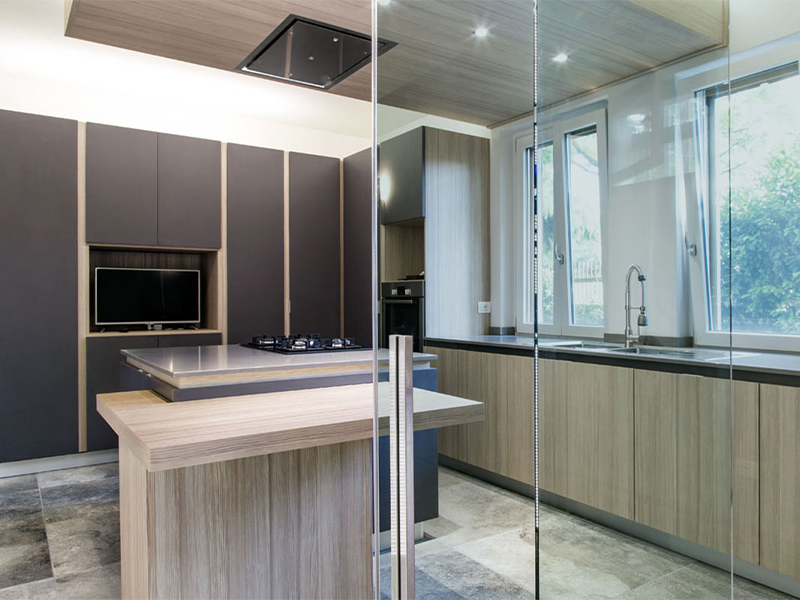 Interni residenziali: Una parete vetrata scorrevole, separa il living dalla cucina ma nel contempo permette di chiudere ed isolare la zona cottura. La realizzazione finale predilige materiali dai toni naturali e “soft-touch”, rovere, pelle, cuoio trattato.