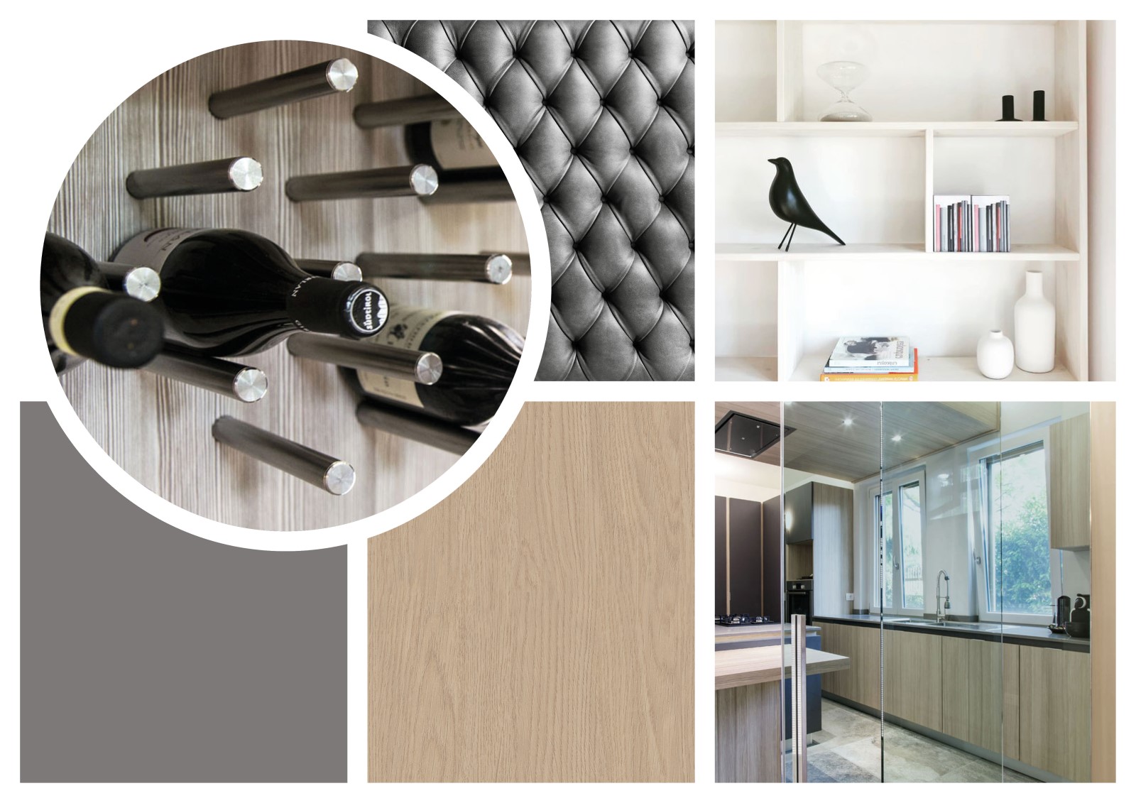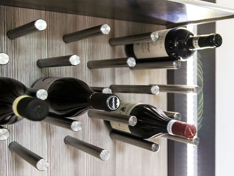 Contrapposizioni per un mood industriale e contemporaneo, cemento della pavimentazione, acciaio satinato del porta bottiglie e per i profili del vetro La cucina in rovere e grigio antracite riprende i toni e l'atmosfera del soggiorno, il pavimento in pietra naturale Onice ne mette in risalto le forme.