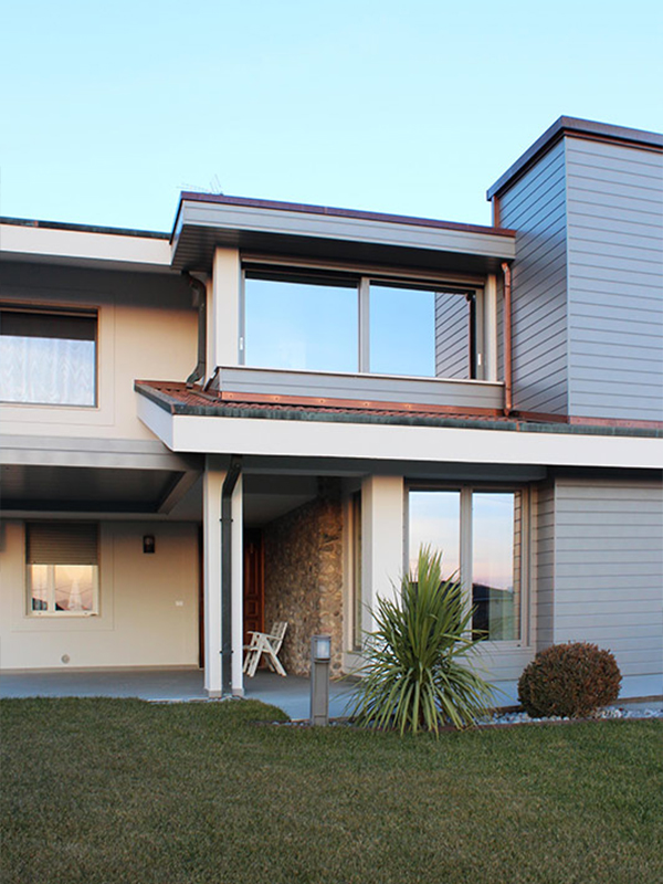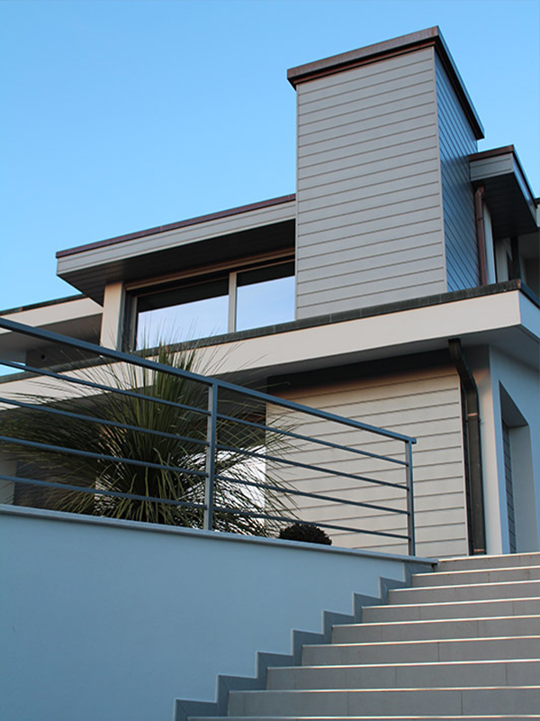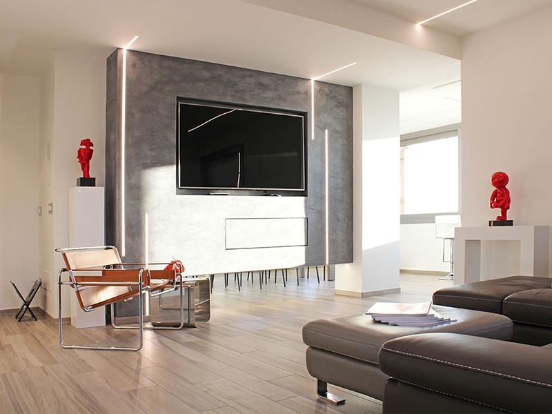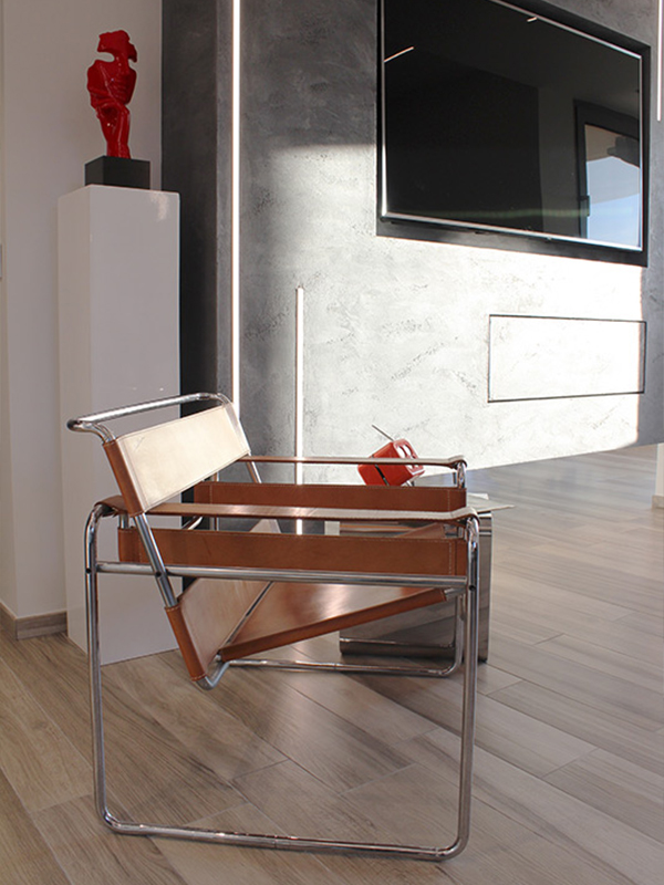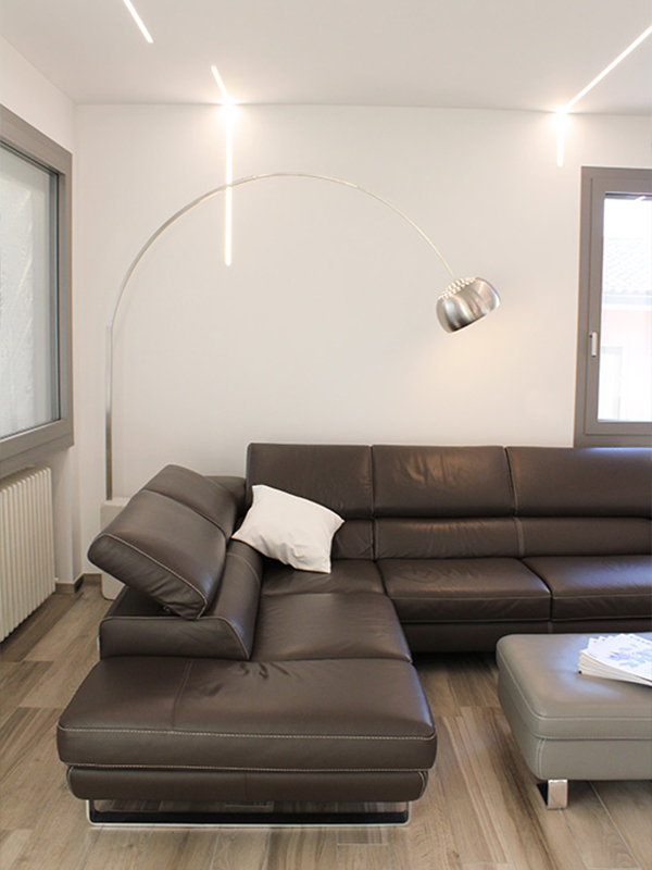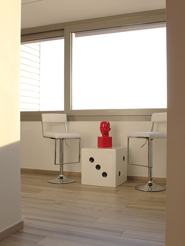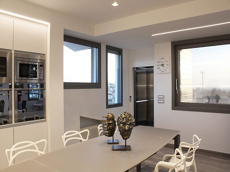 Un monolitico parallelepipedo di cemento, sospeso dal pavimento divide la cucina dal living e ospita il cuore tecnologico multimediale della casa. Le ampie finestre connettono visivamente l’interno e l’esterno portando luce naturale agli ambienti già poderosamente luminosi. La torre dogata taglia in verticale le linee longitudinali tese a schiacciare la prospettiva della casa, non più intimoriti dalla dimensione verticale dell’edificio.