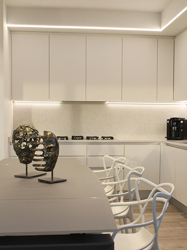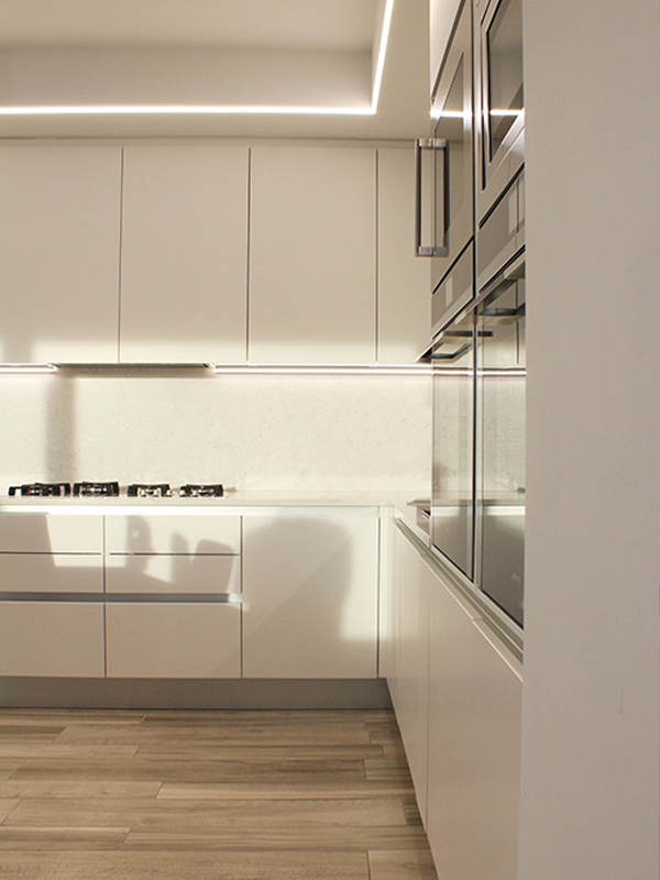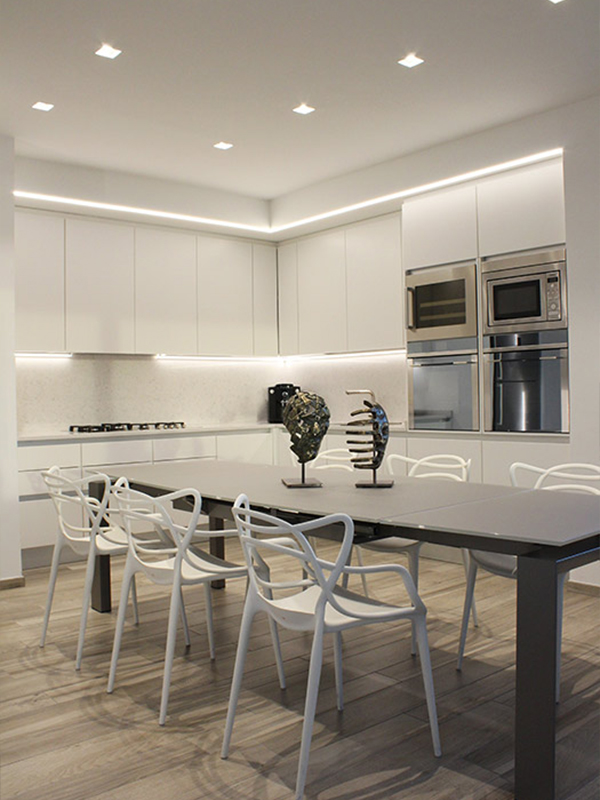 Ristrutturazioni chiavi in mano: Il bianco avvolge tutti gli ambienti ed è motivo conduttore fra gli ambienti e l’arredamento.